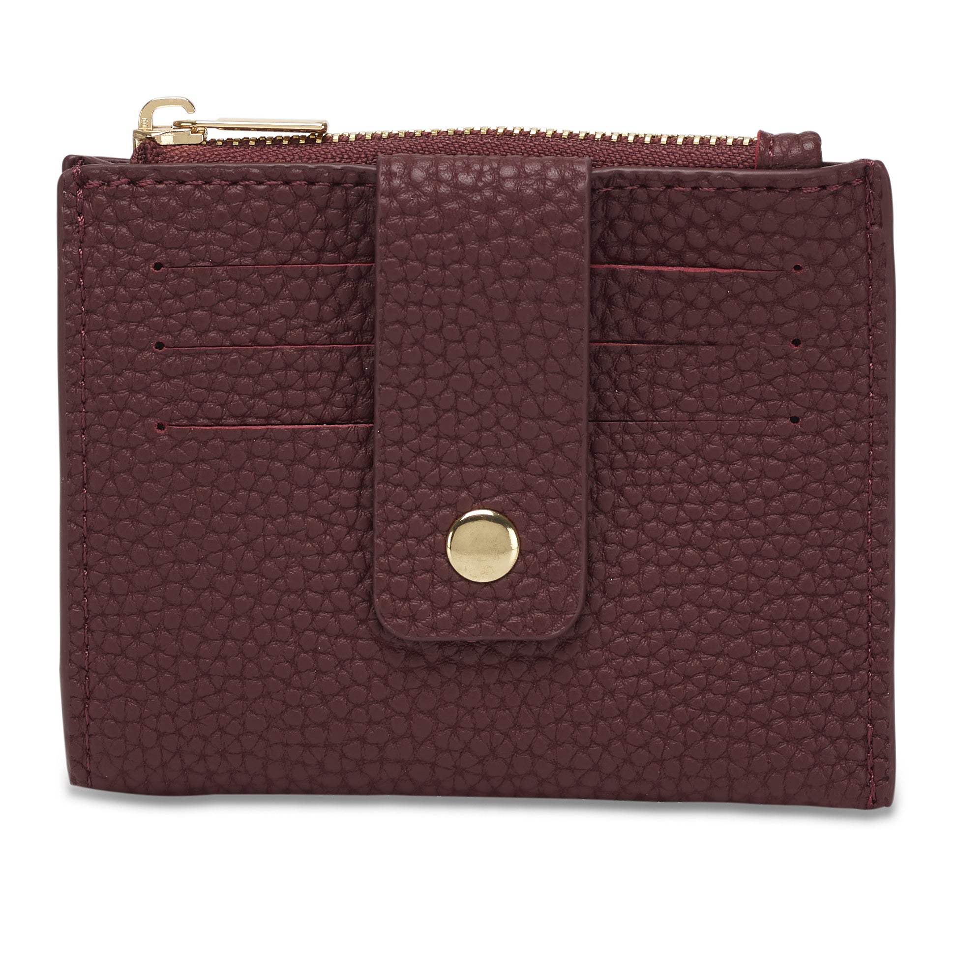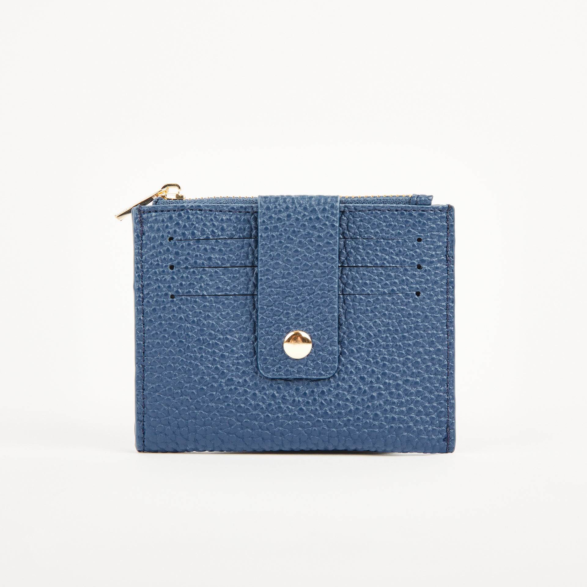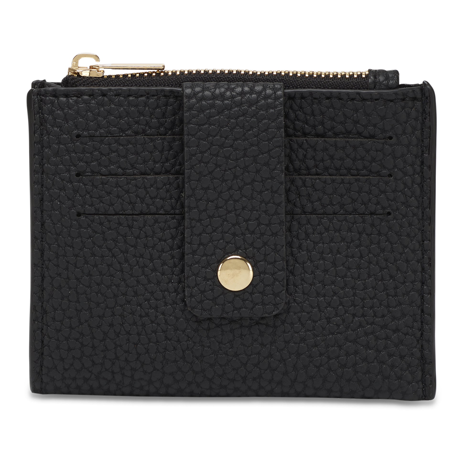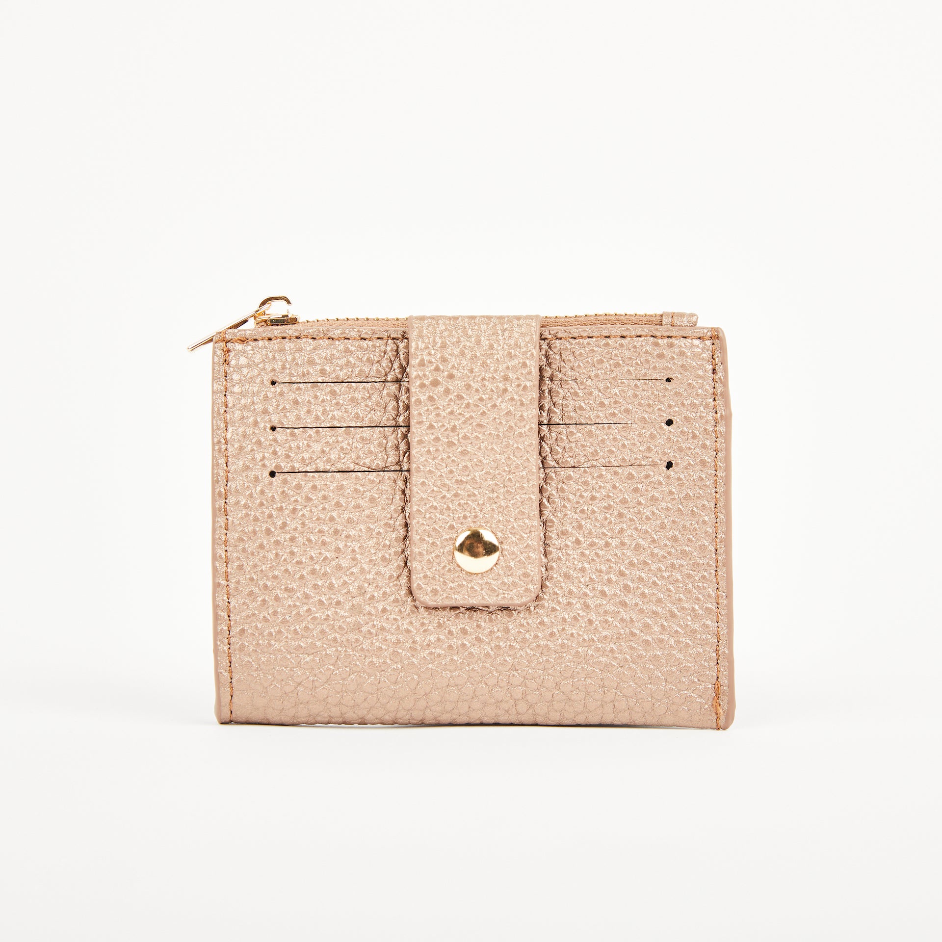 Gold zip with pull with one main coin compartment. 3 card slip to one side and one large slip pock to back.