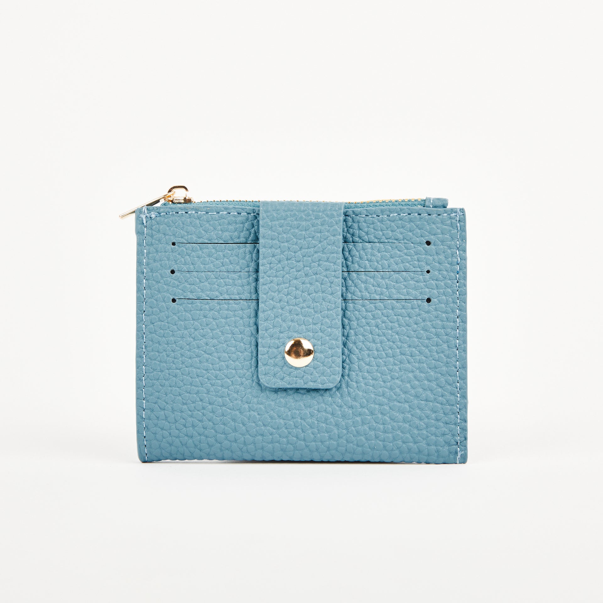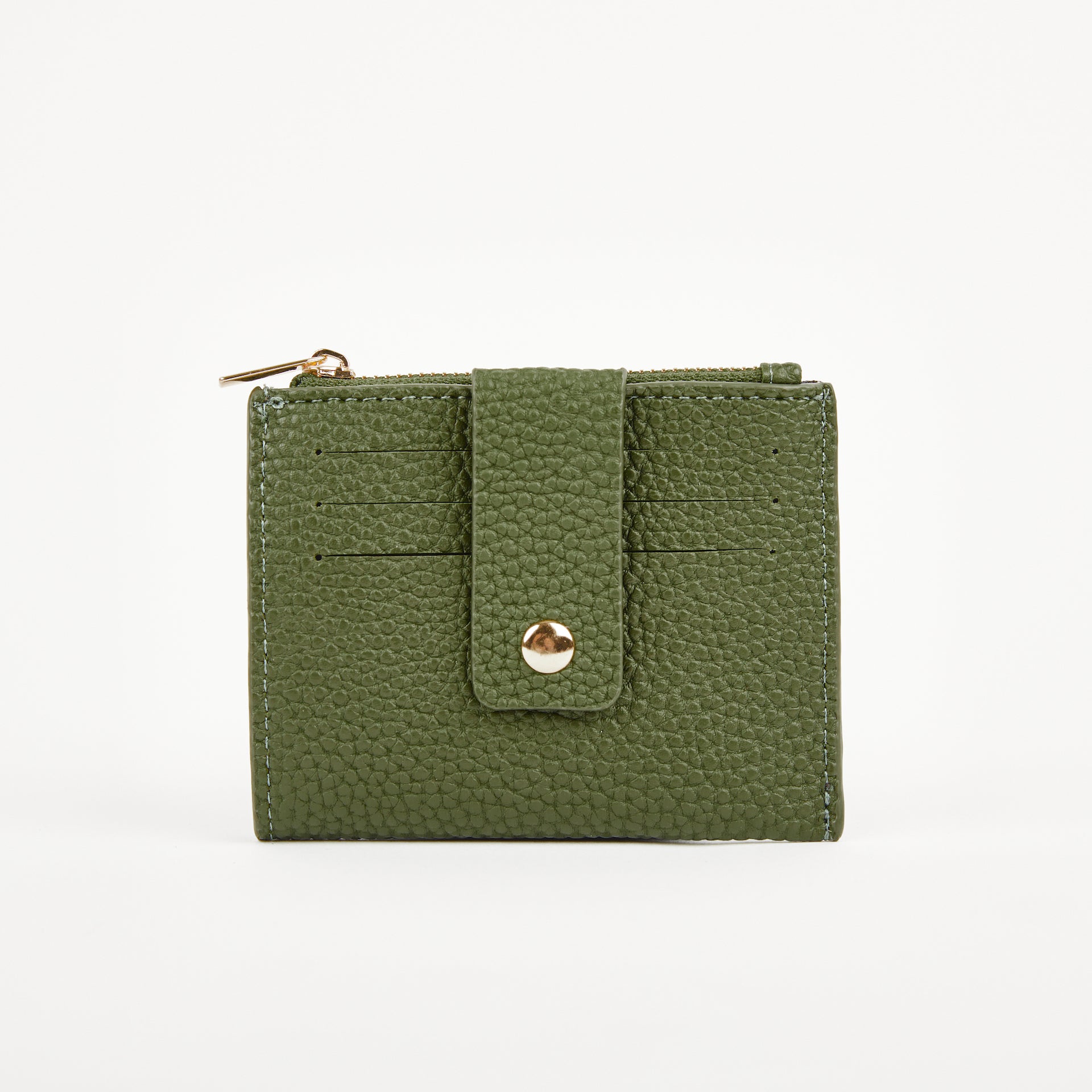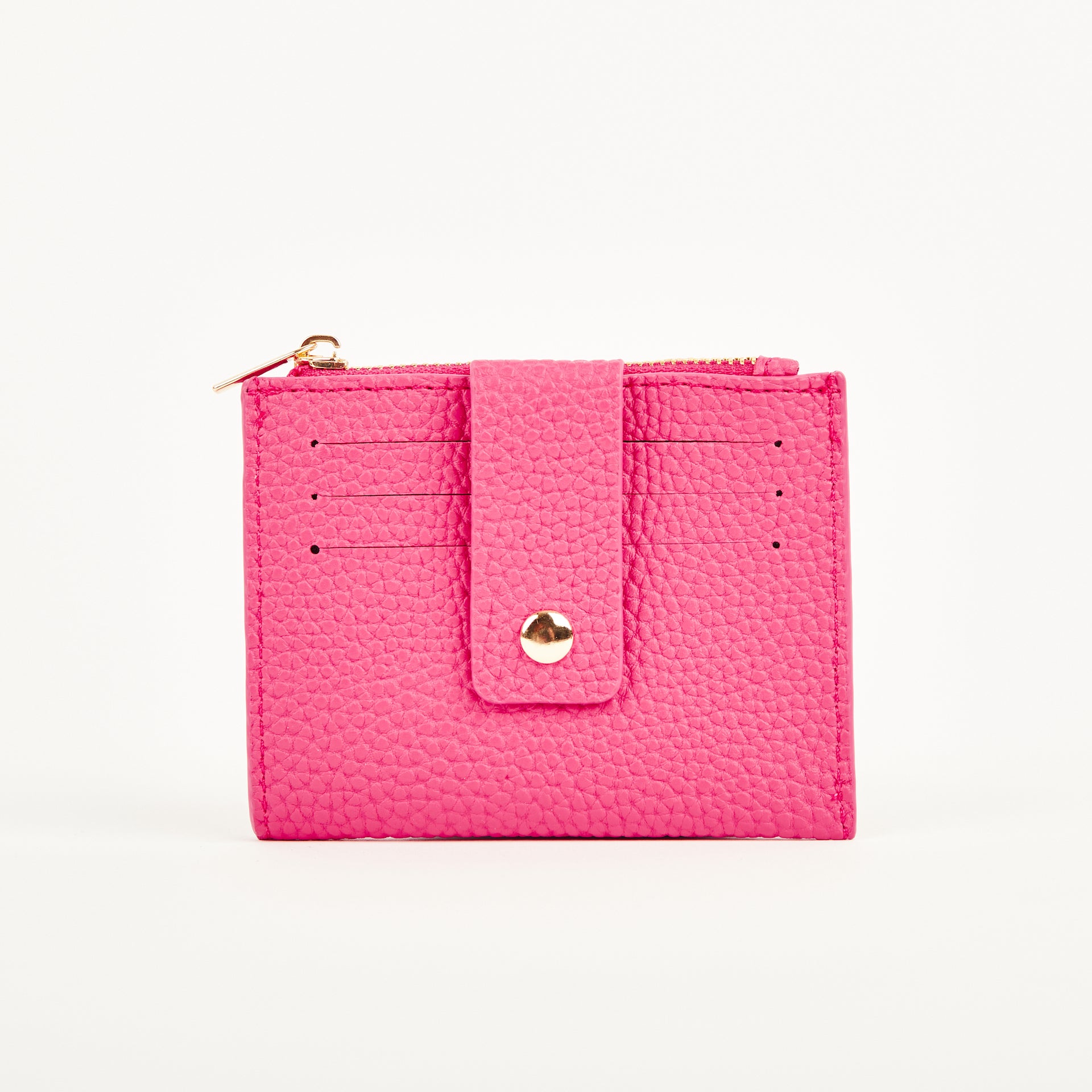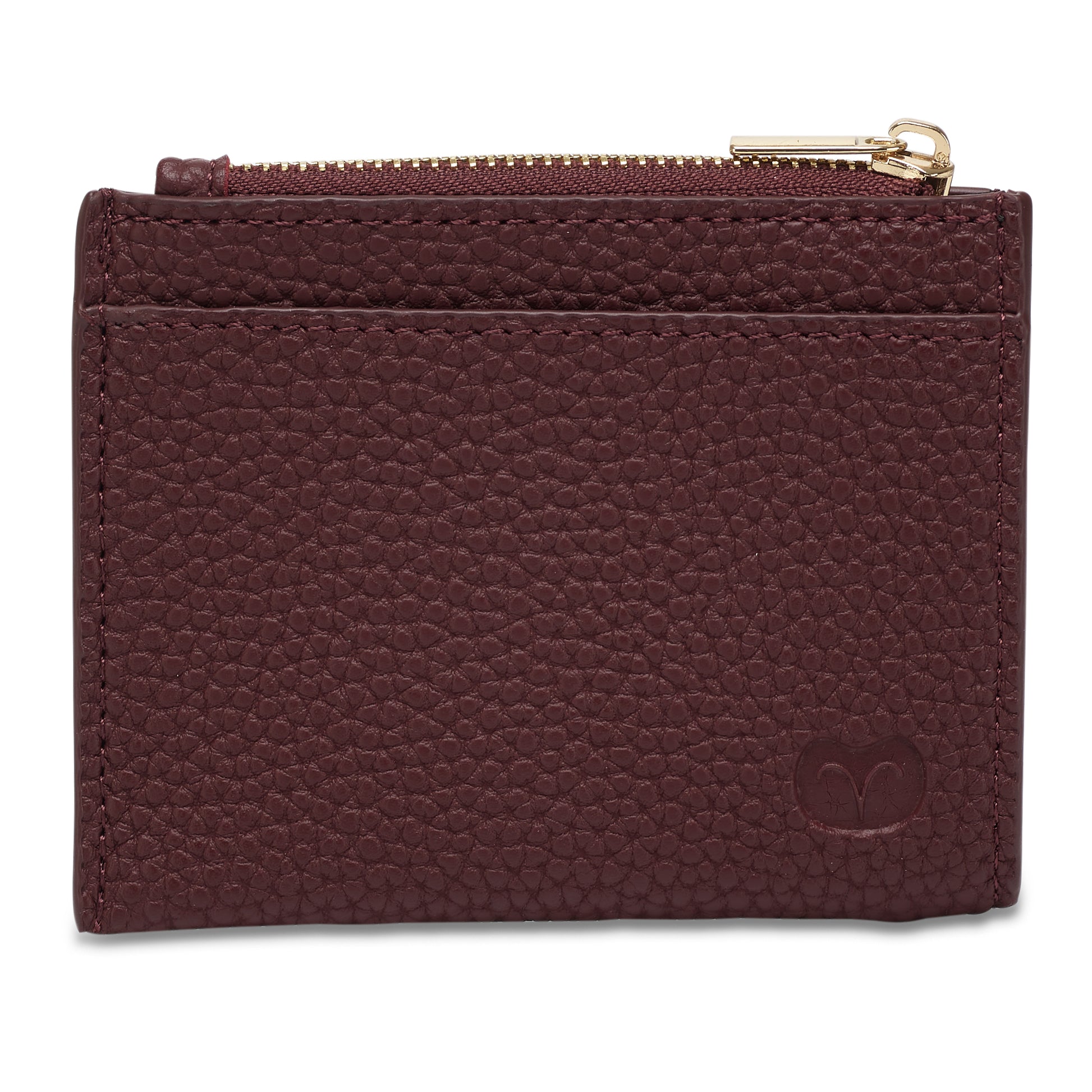 Gold zip with pull with one main coin compartment. 3 card slip to one side and one large slip pock to back.