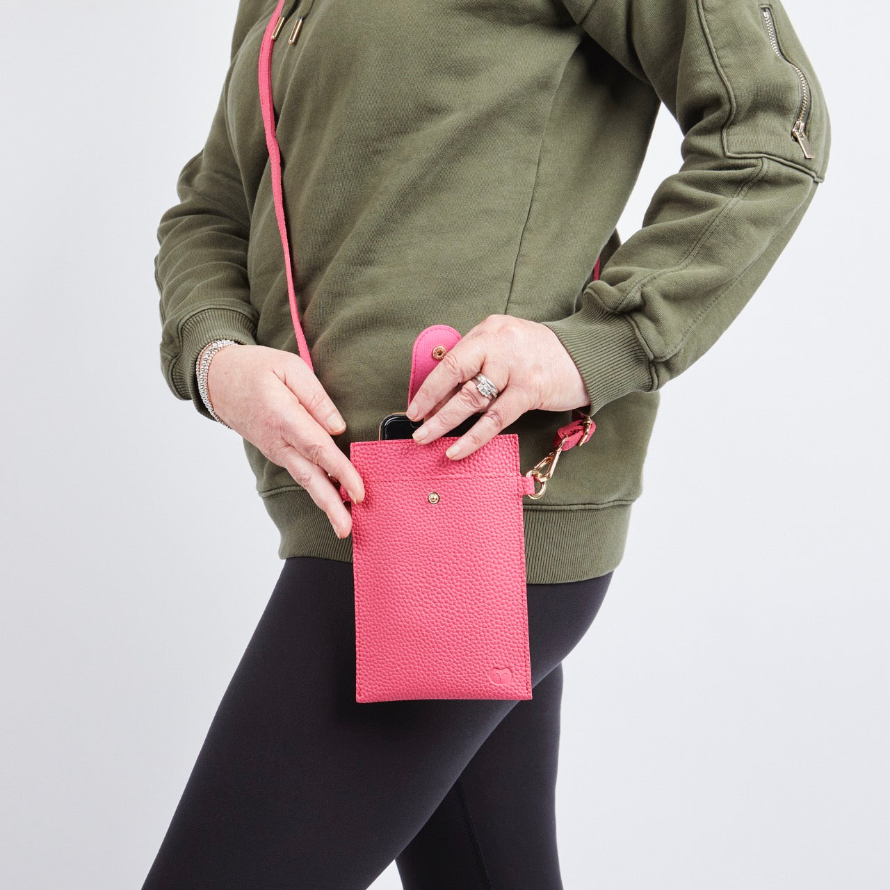 Slim phone pouch but large enough to hold a plus size phone with additional front pocket, 3 card slots to the back and a handy slip pocket for your lipstick and keys.